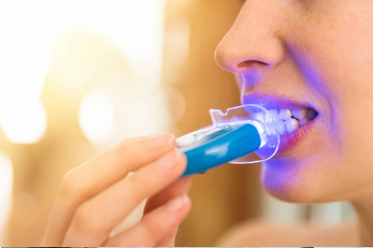 Our in-house tooth whitening solution works much faster than a take-home kit. One of our dental practitioners will apply the whitening gel, which they then activate with a blue light. This quick and easy process results in brighter, whiter teeth in as little as an hour.
